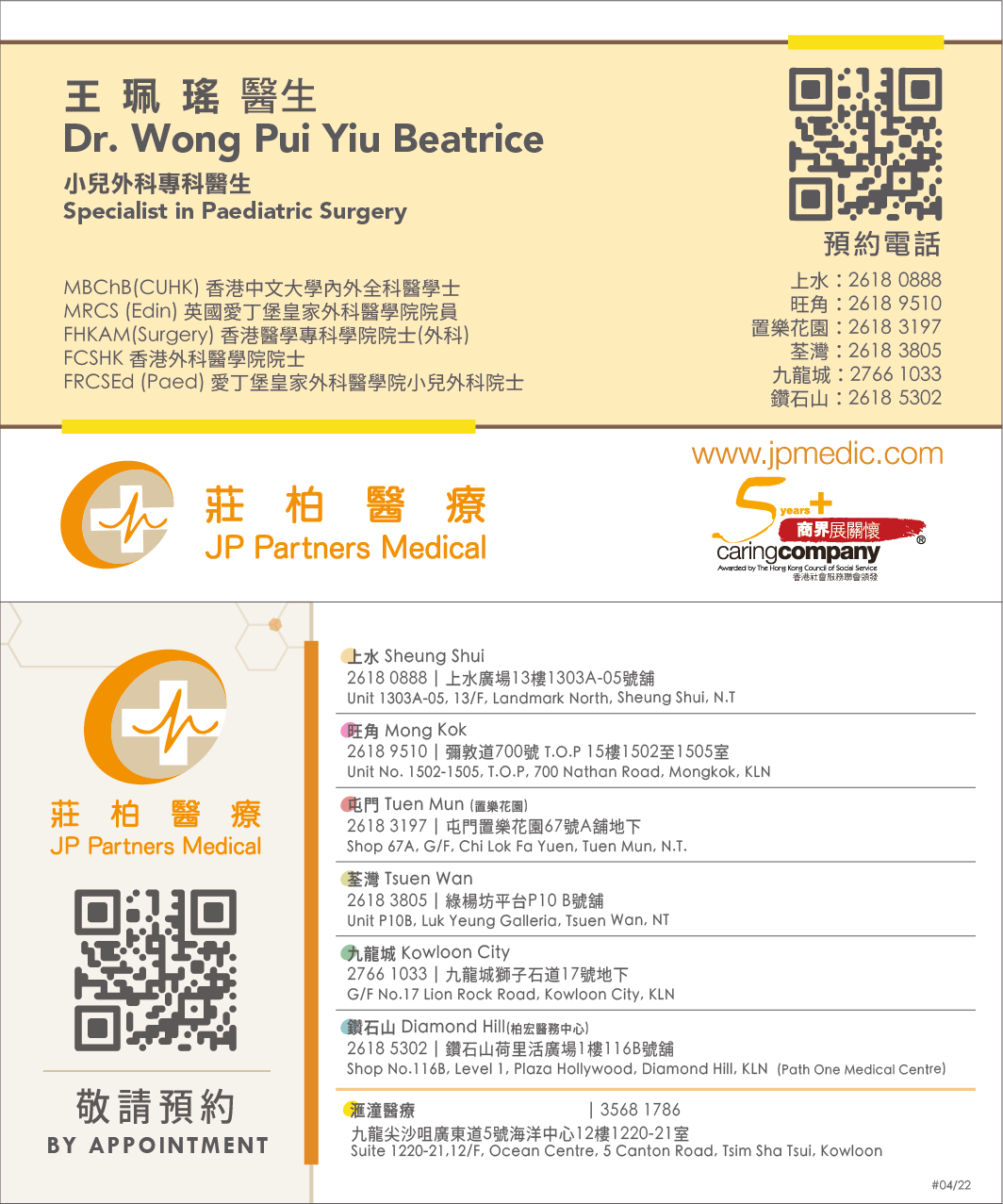 專業資格 MBChB(CUHK) 香港中文大學內外全科醫學士 MRCS (Edin) 英國愛丁堡皇家外科醫學院院員 FHKAM(Surgery) 香港醫學專科學院院士(外科) FCSHK 香港外科醫學院院士 FRCSEd (Paed) 愛丁堡皇家外科醫學院小兒外科院士